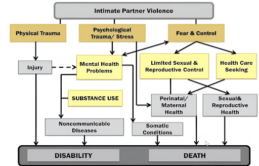 The diagram below illustrates how Intimate Partner Violence (IPV), one of the forms of GBV, can initiate a complex chain of physical, psychological, and reproductive health consequences that may ultimately lead to long-term disability or death.